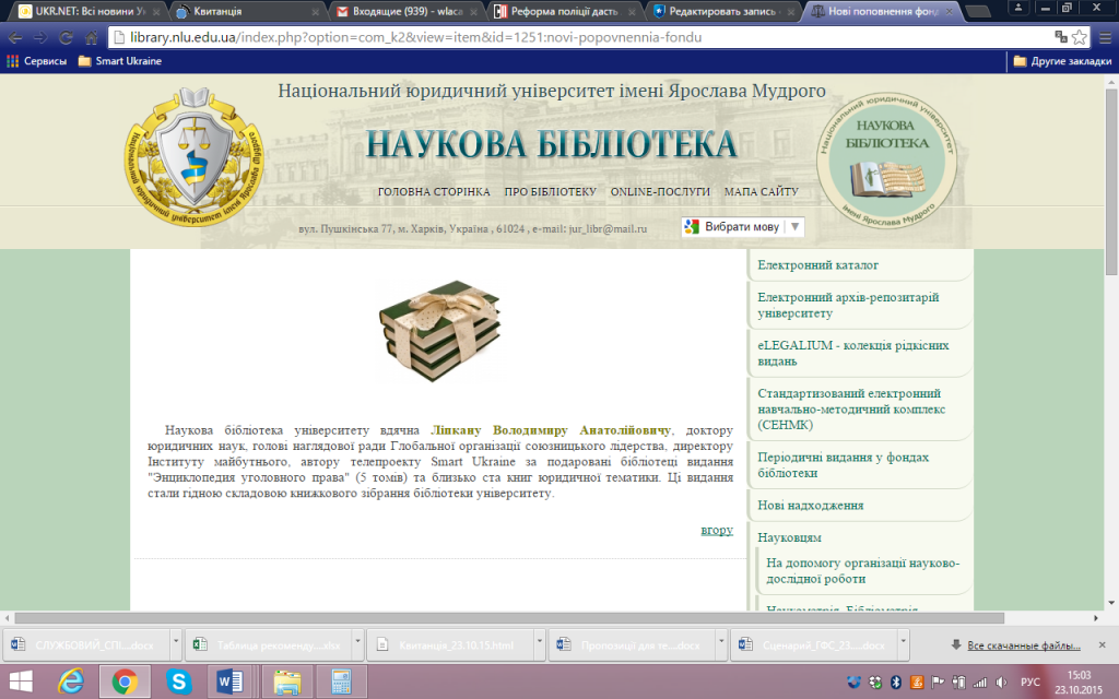 Наукова бібліотека Національного юридичного університету імені Ярослава Мудрого вдячна Ліпкану Володимиру Анатолійовичу, доктору юридичних наук, голові наглядової ради Глобальної організації союзницького лідерства, директору Інституту майбутнього, автору телепроекту Smart Ukraine за подаровані бібліотеці видання “Энциклопедия уголовного права” (5 томів) та близько ста книг юридичної тематики. Ці видання стали гідною складовою книжкового зібрання бібліотеки університету.